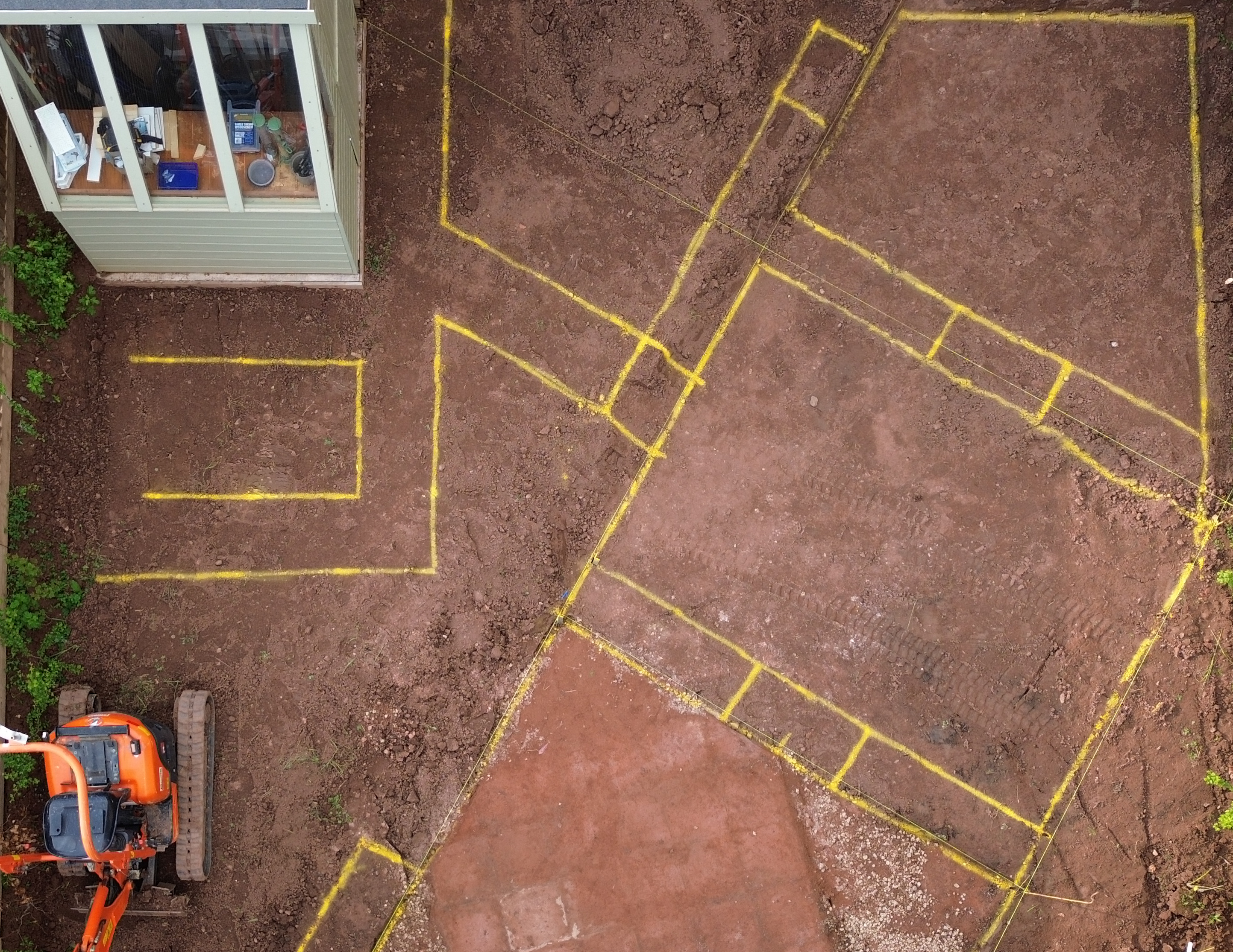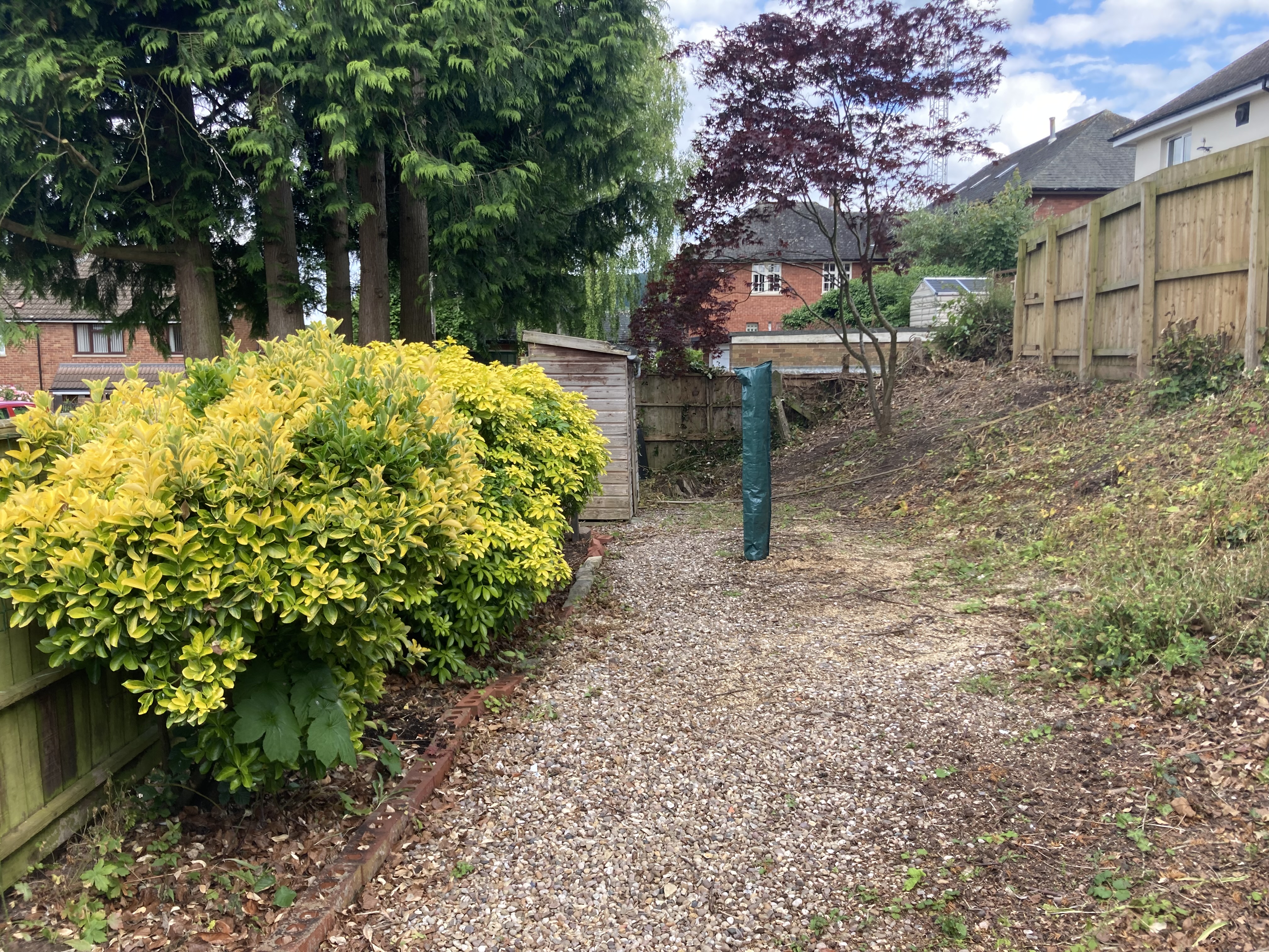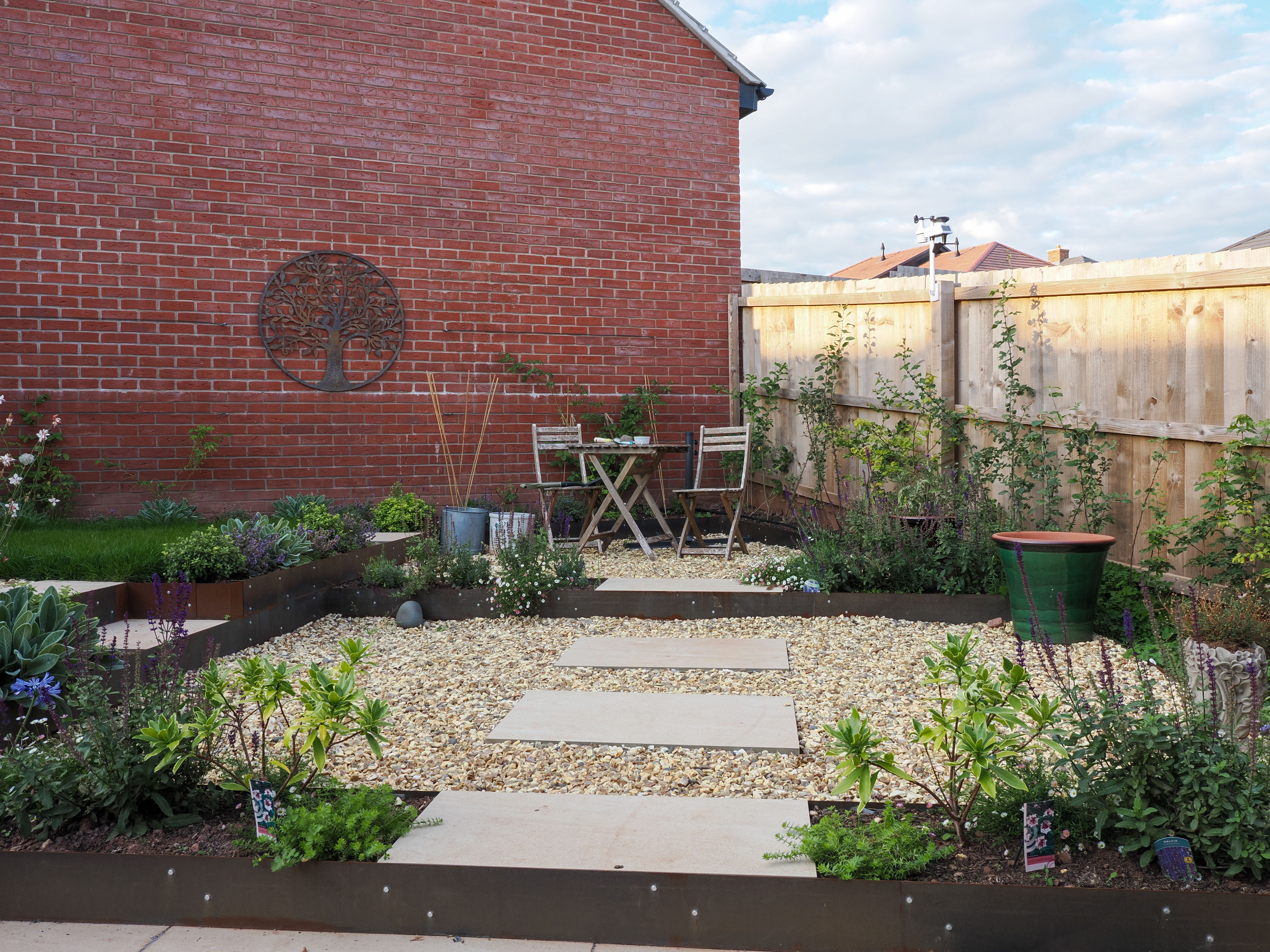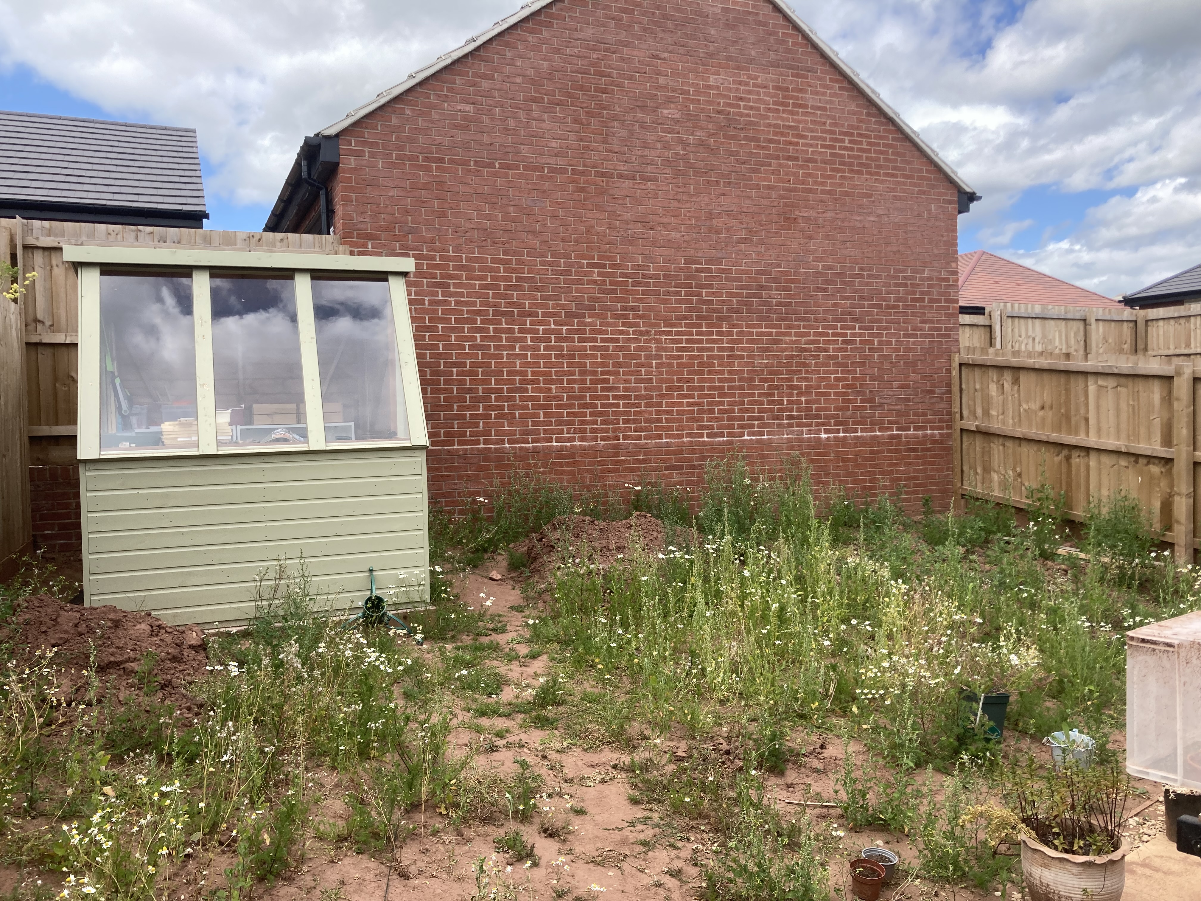 When I first visited this new garden, within a new development built on former agricultural land, there was simply a shed, a sloping patch of weeds and a view of a large brick garage gable end.