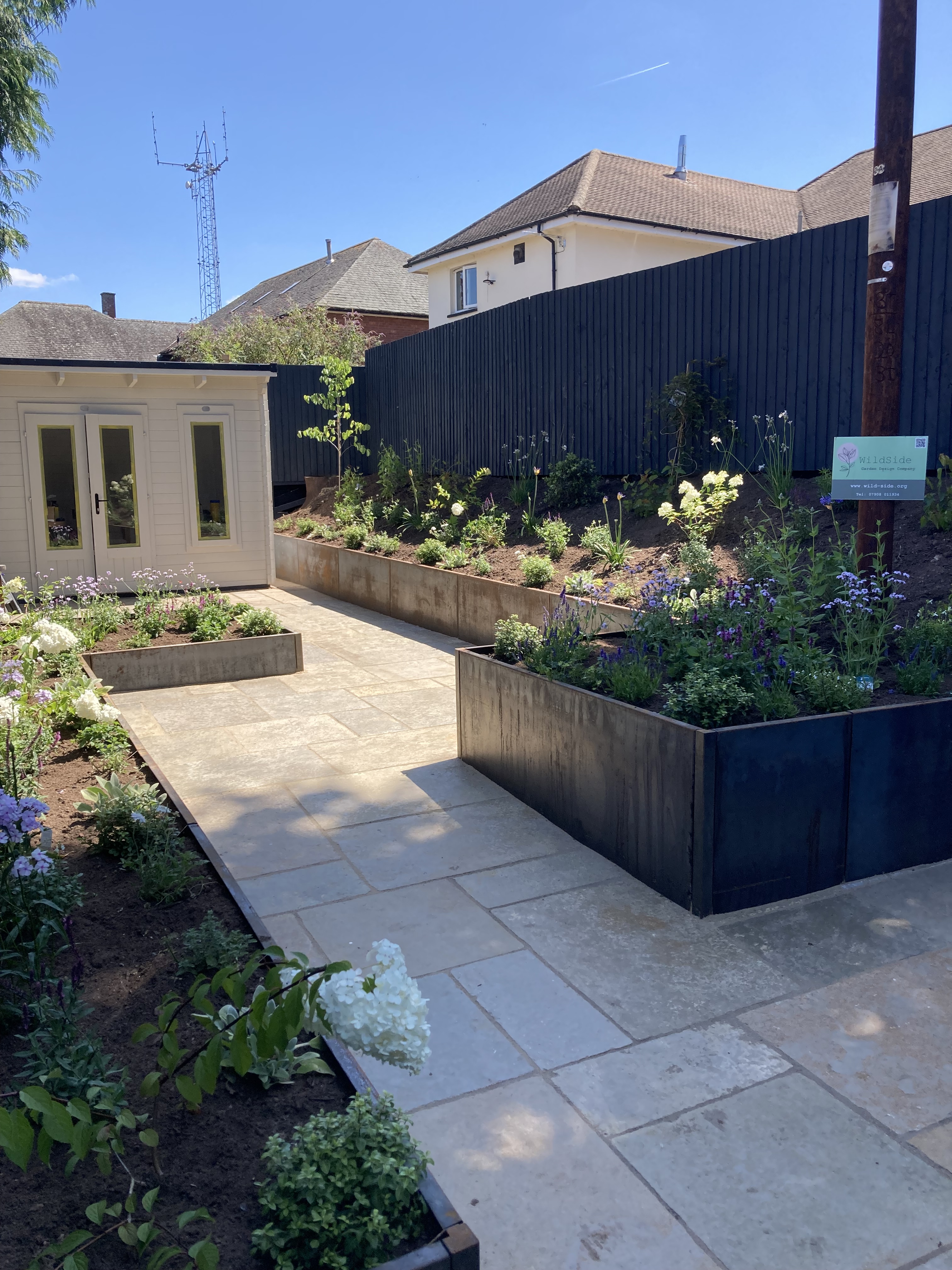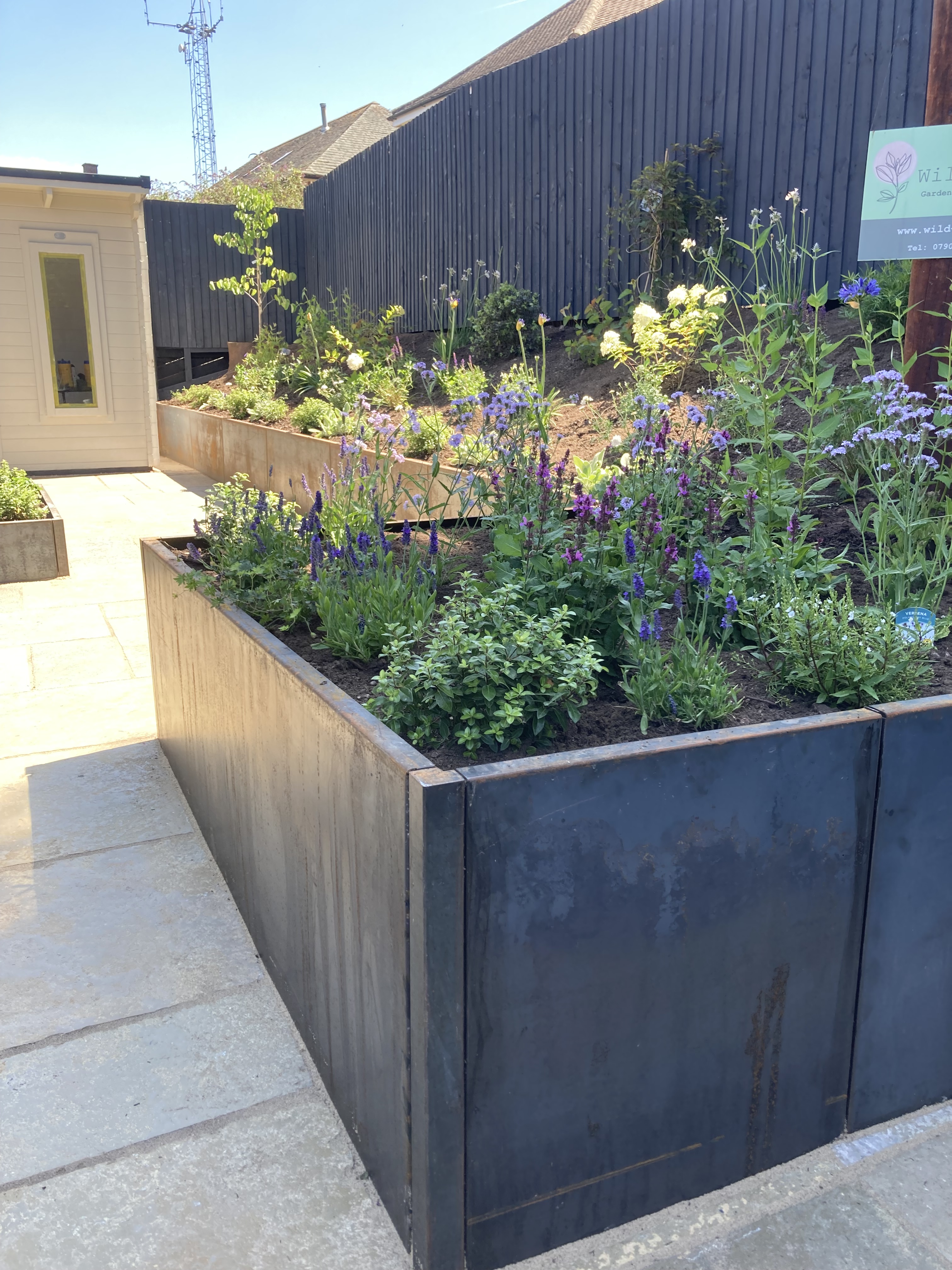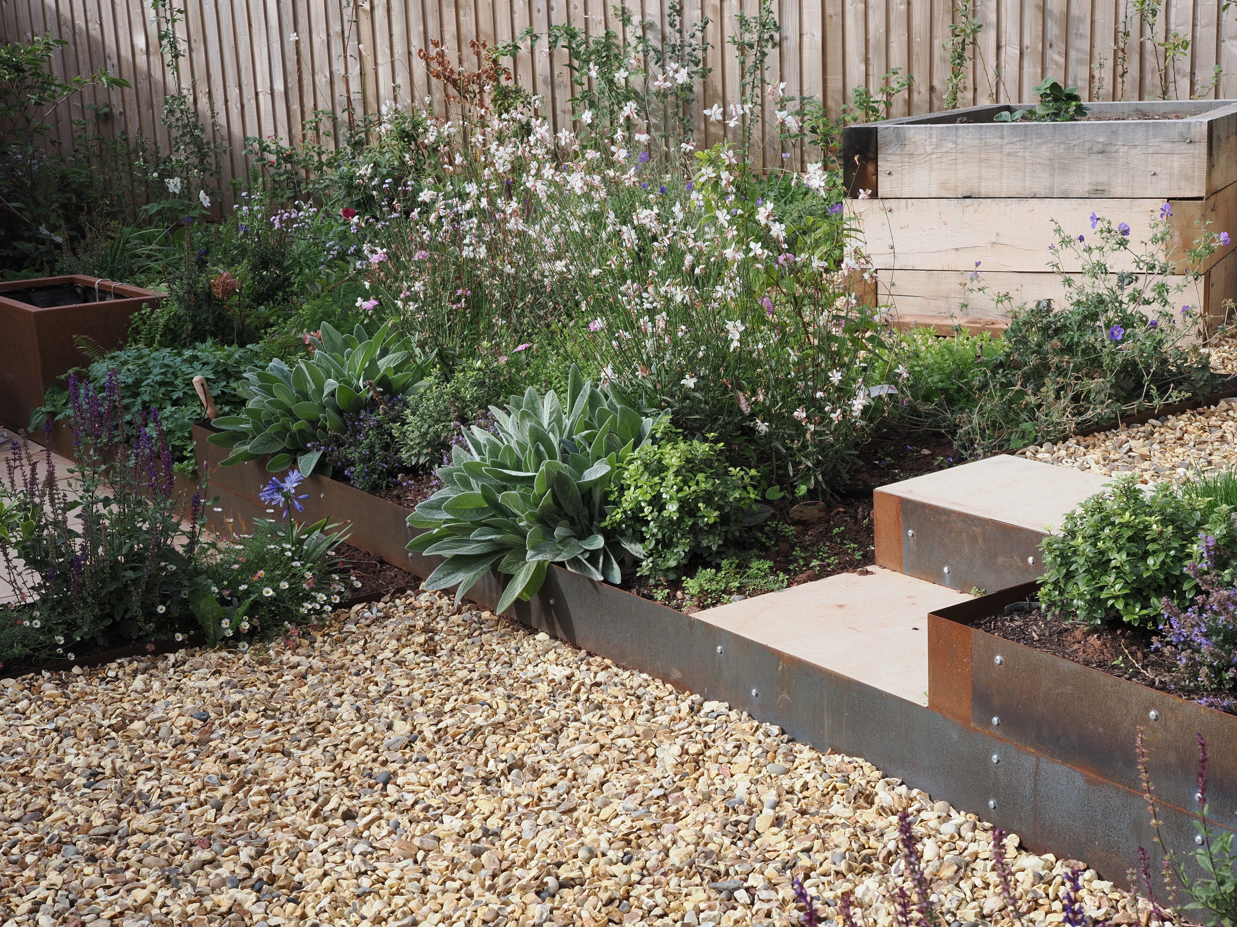 The once steep slope up to the fence, has been retained by weathering steel and planted with a variety of scented shrubs including Deutzias and Philadelphus together with pollinator attracting Lavender, Salvias, Phlox and Scabious in a variety of pinks, whites and lilacs.